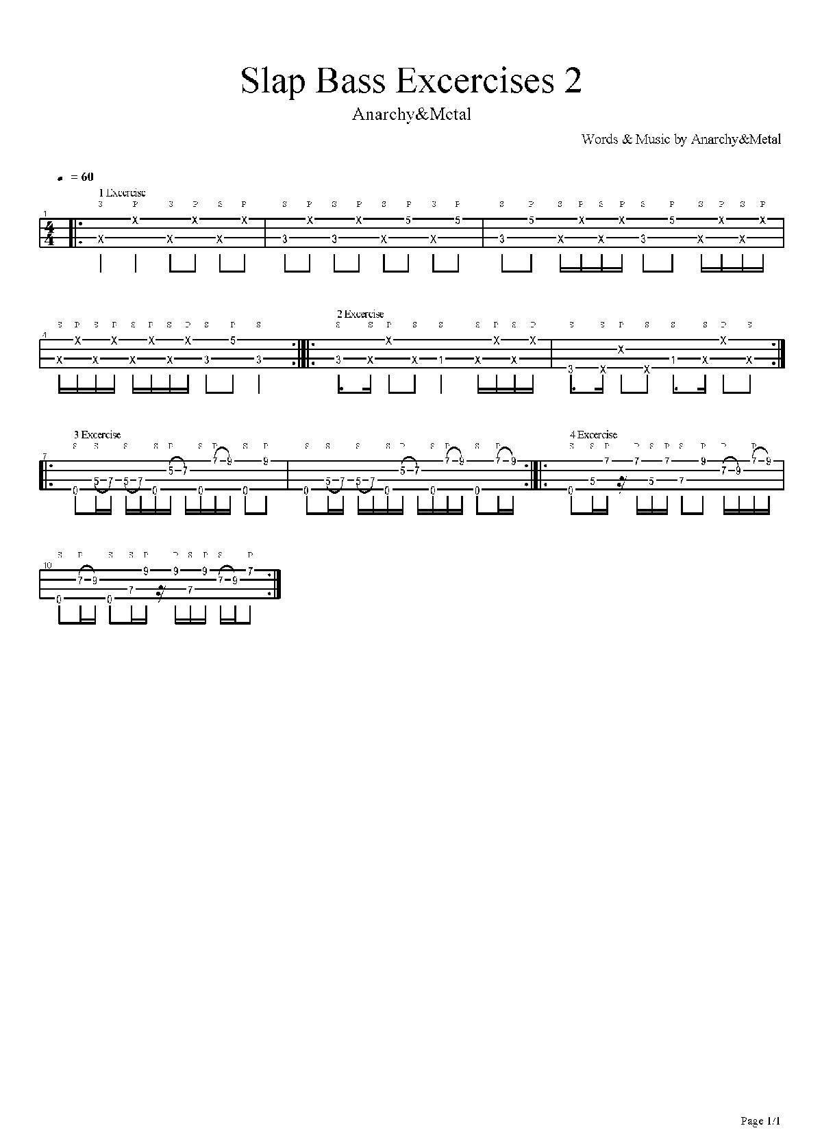 贝司乐谱【Bass Exercises - Slap Bass Excercises】Bass谱简谱五线谱附歌词是乐器资源网于2017年03月10日 01:17:29整理更新,内容收录在电贝司乐谱栏目;乐器资源网免费分享专业、准确、规范、高清的电贝司乐谱简谱五线谱歌词等电子版资料,欢迎在线免费下载;乐器资源网无需注册会员,即可直接免费下载各类乐器学习相关资源。