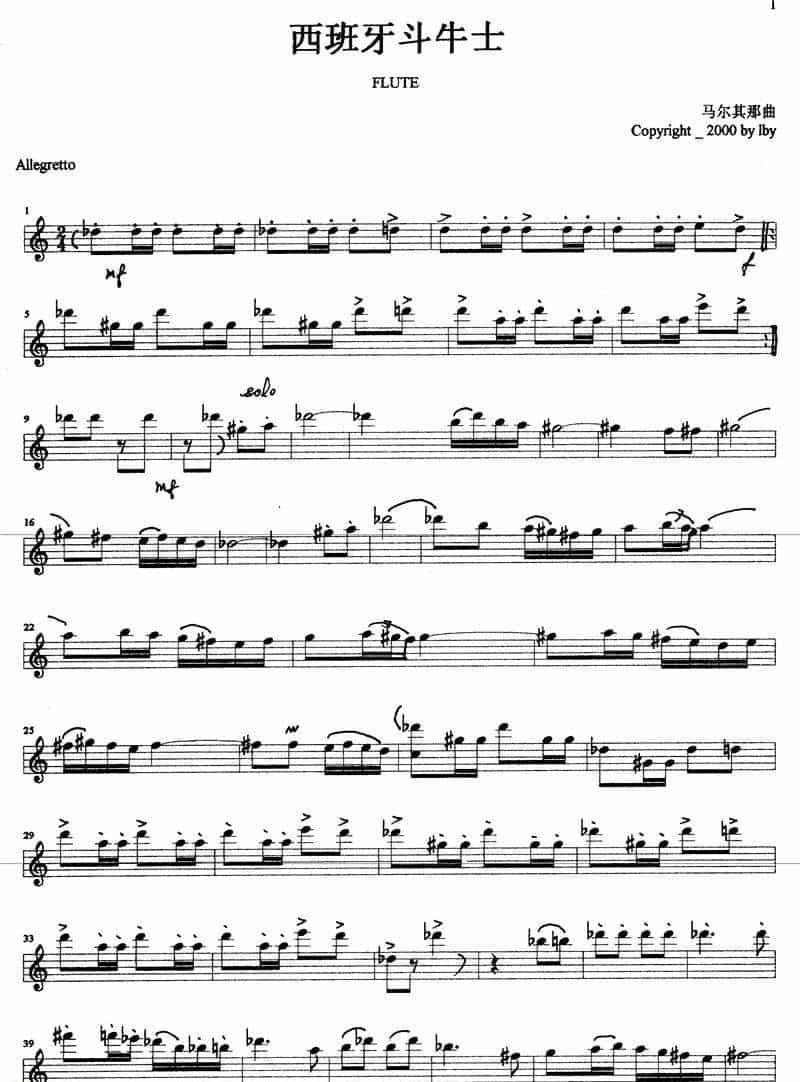 西班牙斗牛士 Espanol matador简谱五线谱附歌词是乐器资源网于2014年04月17日 10:57:16整理更新,内容收录在长笛乐谱栏目;乐器资源网免费分享专业、准确、规范、高清的长笛乐谱简谱五线谱歌词等电子版资料,欢迎在线免费下载;乐器资源网无需注册会员,即可直接免费下载各类乐器学习相关资源。