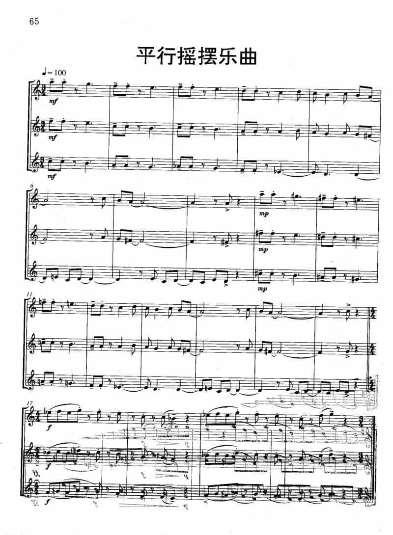 长笛三重奏乐谱:平行摇摆乐曲 Parallel Swing简谱五线谱附歌词是乐器资源网于2014年03月23日 20:56:12整理更新,内容收录在长笛乐谱栏目;乐器资源网免费分享专业、准确、规范、高清的长笛乐谱简谱五线谱歌词等电子版资料,欢迎在线免费下载;乐器资源网无需注册会员,即可直接免费下载各类乐器学习相关资源。