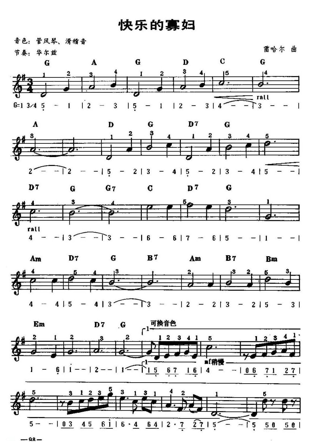 电子琴乐谱《快乐的寡妇》简谱五线谱对照配和弦简谱五线谱附歌词是乐器资源网于2017年04月09日 16:21:34整理更新,内容收录在电子琴乐谱栏目;乐器资源网免费分享专业、准确、规范、高清的电子琴乐谱简谱五线谱歌词等电子版资料,欢迎在线免费下载;乐器资源网无需注册会员,即可直接免费下载各类乐器学习相关资源。
