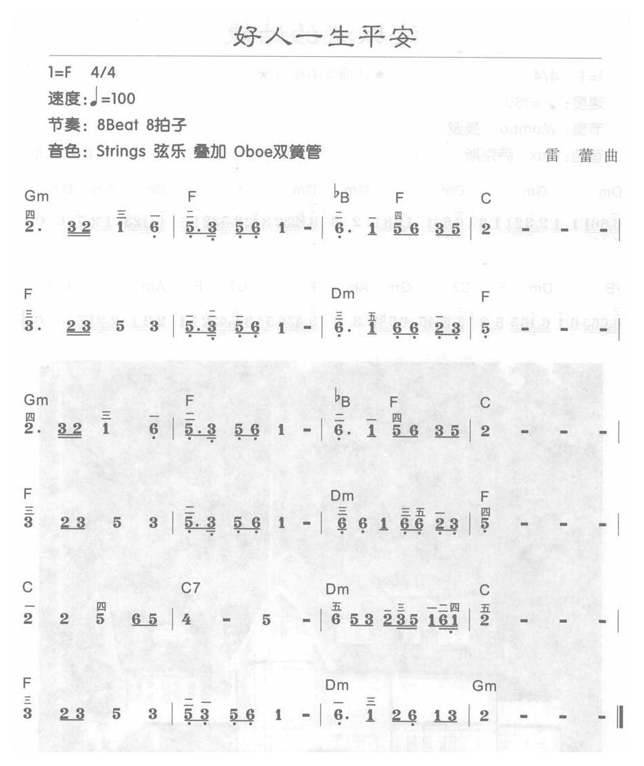 电子琴F大调d小调乐曲【好人一生平安】简谱配和弦简谱五线谱附歌词是乐器资源网于2017年03月23日 11:54:45整理更新,内容收录在电子琴乐谱栏目;乐器资源网免费分享专业、准确、规范、高清的电子琴乐谱简谱五线谱歌词等电子版资料,欢迎在线免费下载;乐器资源网无需注册会员,即可直接免费下载各类乐器学习相关资源。