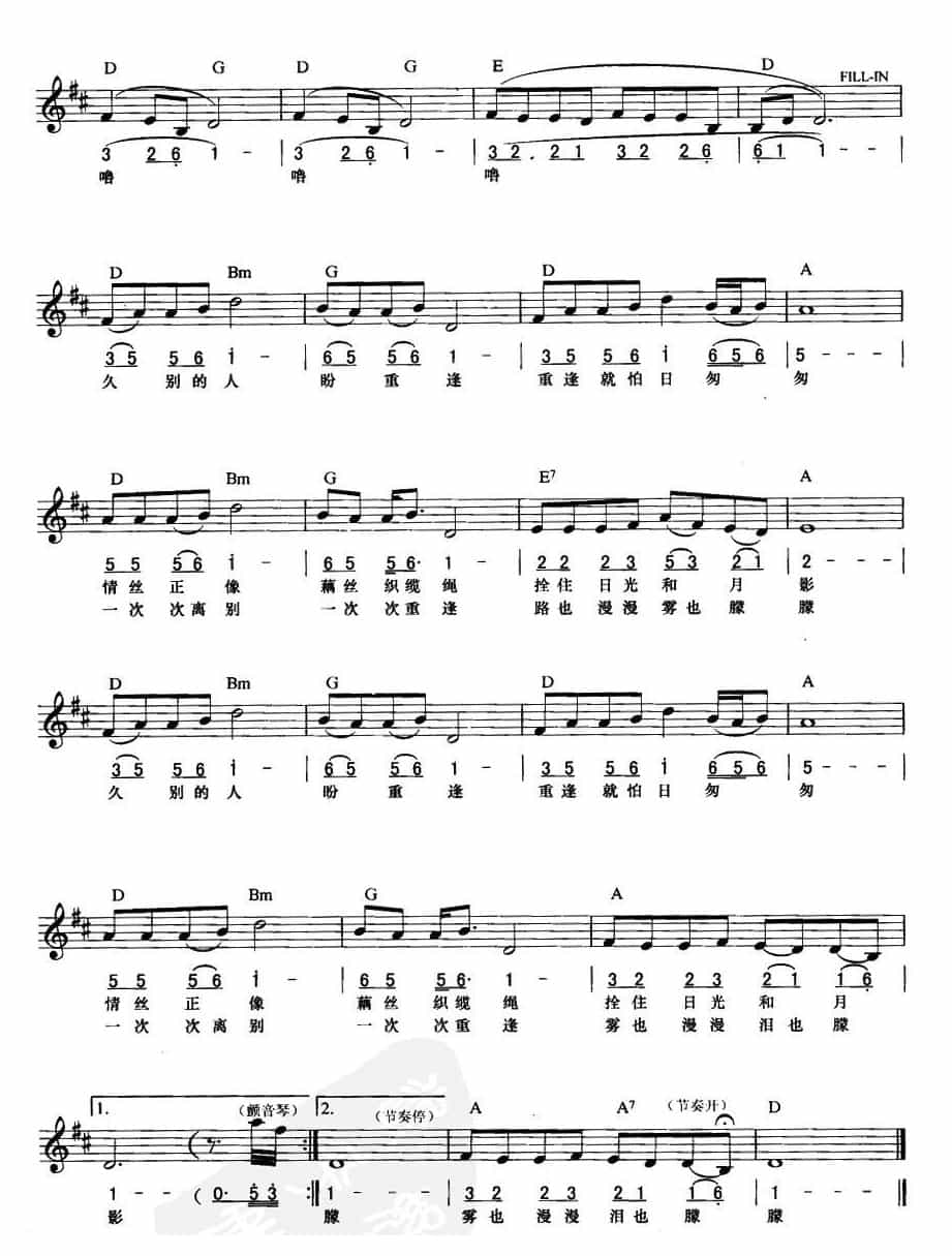 久别的人简谱五线谱附歌词是乐器资源网于2014年09月28日 10:31:04整理更新,内容收录在电子琴乐谱栏目;乐器资源网免费分享专业、准确、规范、高清的电子琴乐谱简谱五线谱歌词等电子版资料,欢迎在线免费下载;乐器资源网无需注册会员,即可直接免费下载各类乐器学习相关资源。