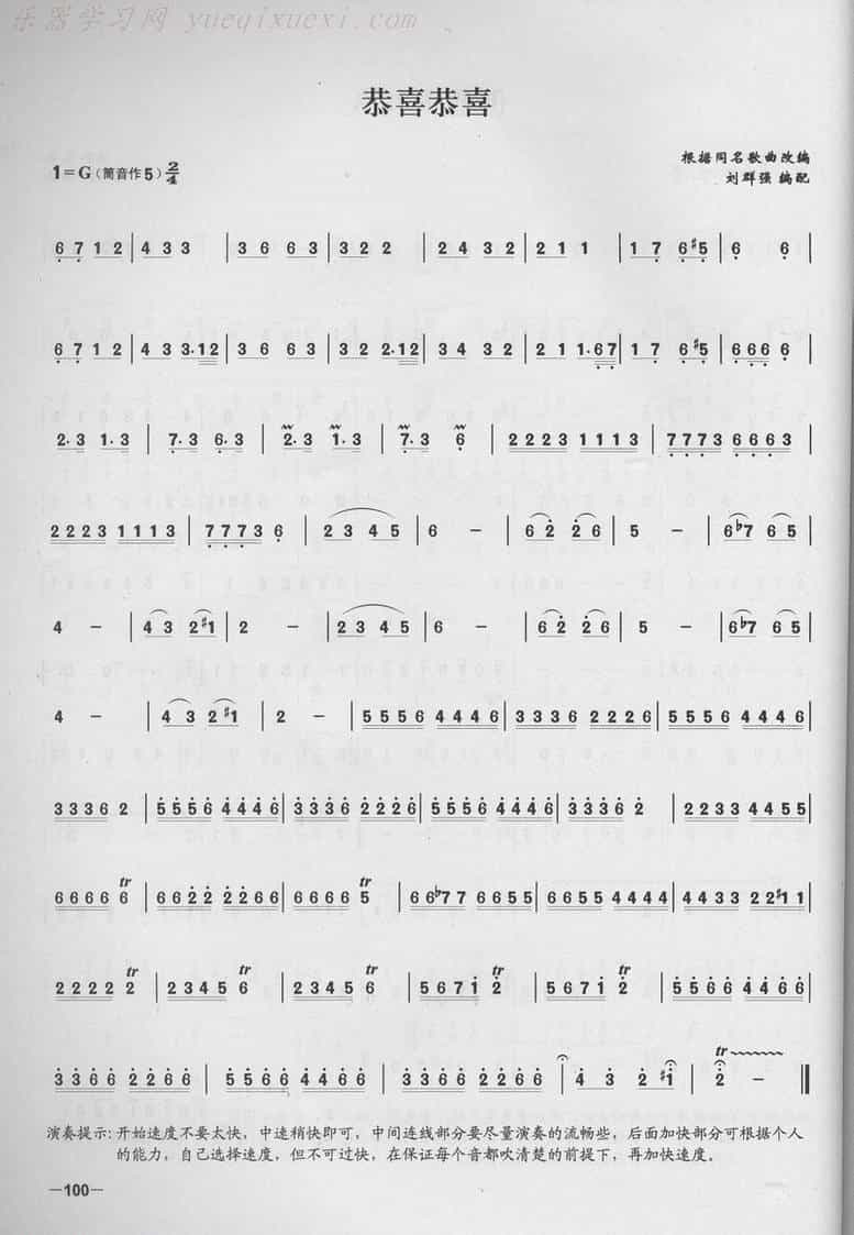 笛子演奏通俗歌曲谱之:恭喜恭喜简谱五线谱附歌词是乐器资源网于2013年04月22日 22:43:37整理更新,内容收录在竹笛乐谱栏目;乐器资源网免费分享专业、准确、规范、高清的竹笛乐谱简谱五线谱歌词等电子版资料,欢迎在线免费下载;乐器资源网无需注册会员,即可直接免费下载各类乐器学习相关资源。