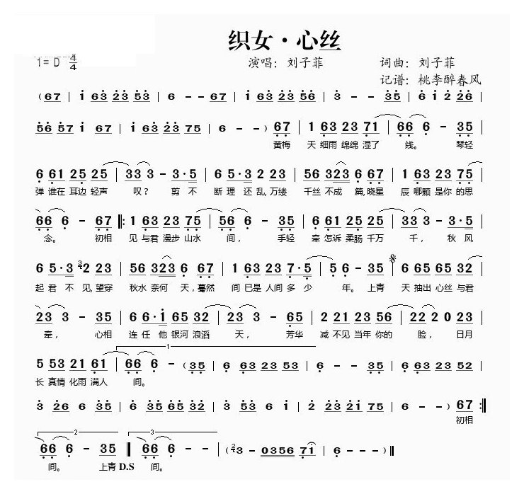 洞箫简谱 织女·心丝简谱五线谱附歌词是乐器资源网于2014年10月16日 14:38:26整理更新,内容收录在洞箫乐谱栏目;乐器资源网免费分享专业、准确、规范、高清的洞箫乐谱简谱五线谱歌词等电子版资料,欢迎在线免费下载;乐器资源网无需注册会员,即可直接免费下载各类乐器学习相关资源。