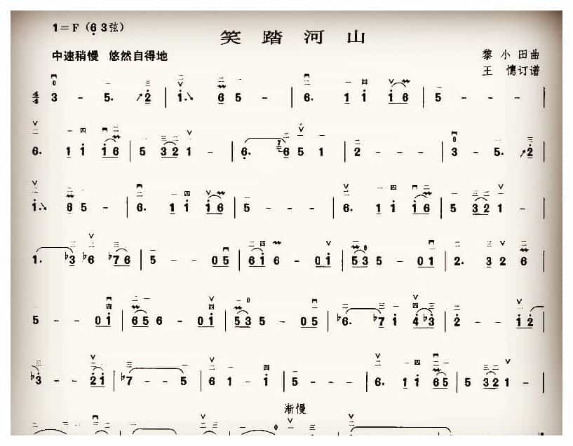 二胡谱【笑踏河山】简谱五线谱附歌词是乐器资源网于2015年12月07日 11:51:58整理更新,内容收录在二胡乐谱栏目;乐器资源网免费分享专业、准确、规范、高清的二胡乐谱简谱五线谱歌词等电子版资料,欢迎在线免费下载;乐器资源网无需注册会员,即可直接免费下载各类乐器学习相关资源。