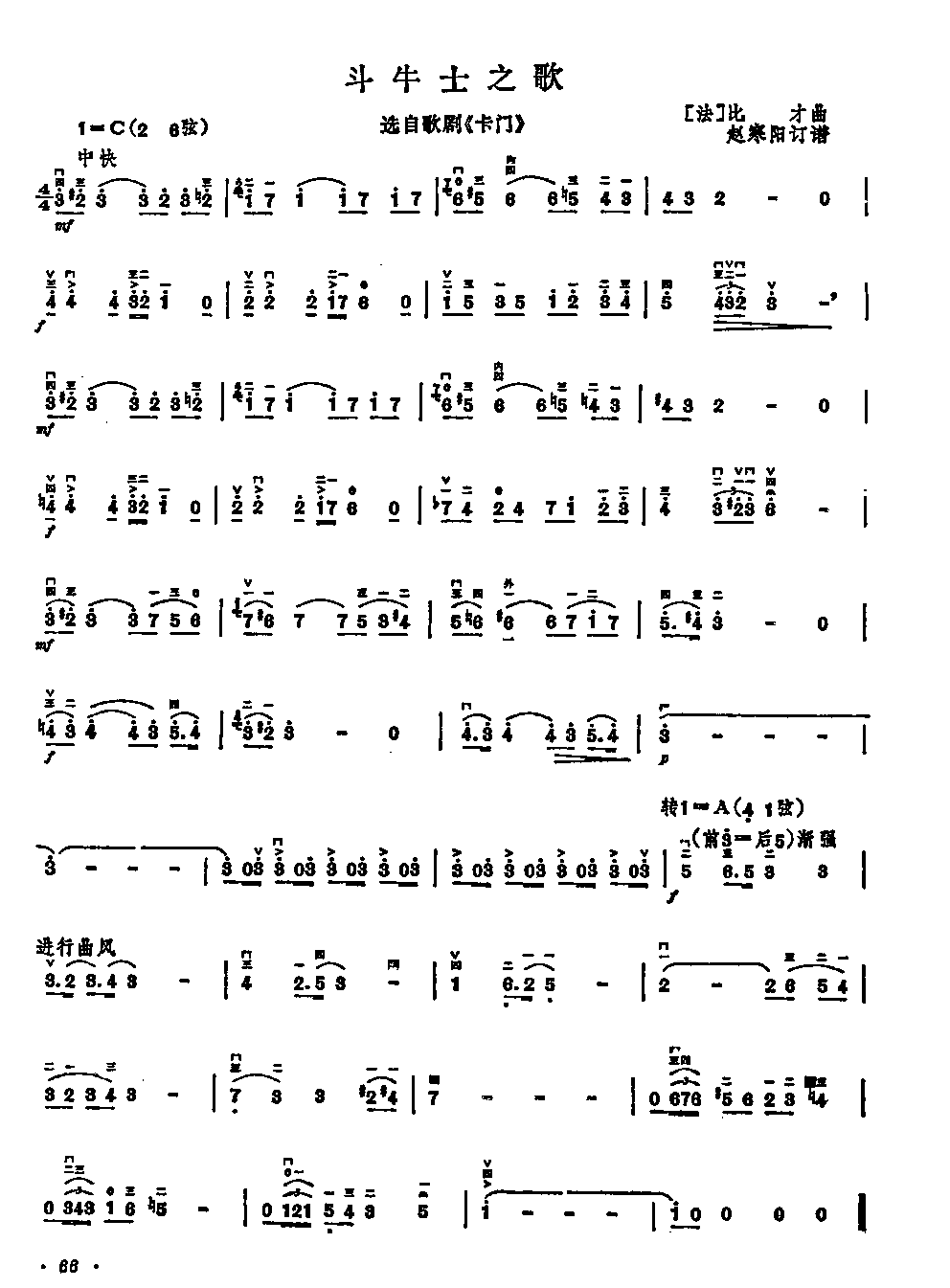 二胡演奏世界名曲100首059【斗牛士之歌】赵寒阳选编简谱五线谱附歌词是乐器资源网于2015年12月26日 16:47:35整理更新,内容收录在二胡乐谱栏目;乐器资源网免费分享专业、准确、规范、高清的二胡乐谱简谱五线谱歌词等电子版资料,欢迎在线免费下载;乐器资源网无需注册会员,即可直接免费下载各类乐器学习相关资源。