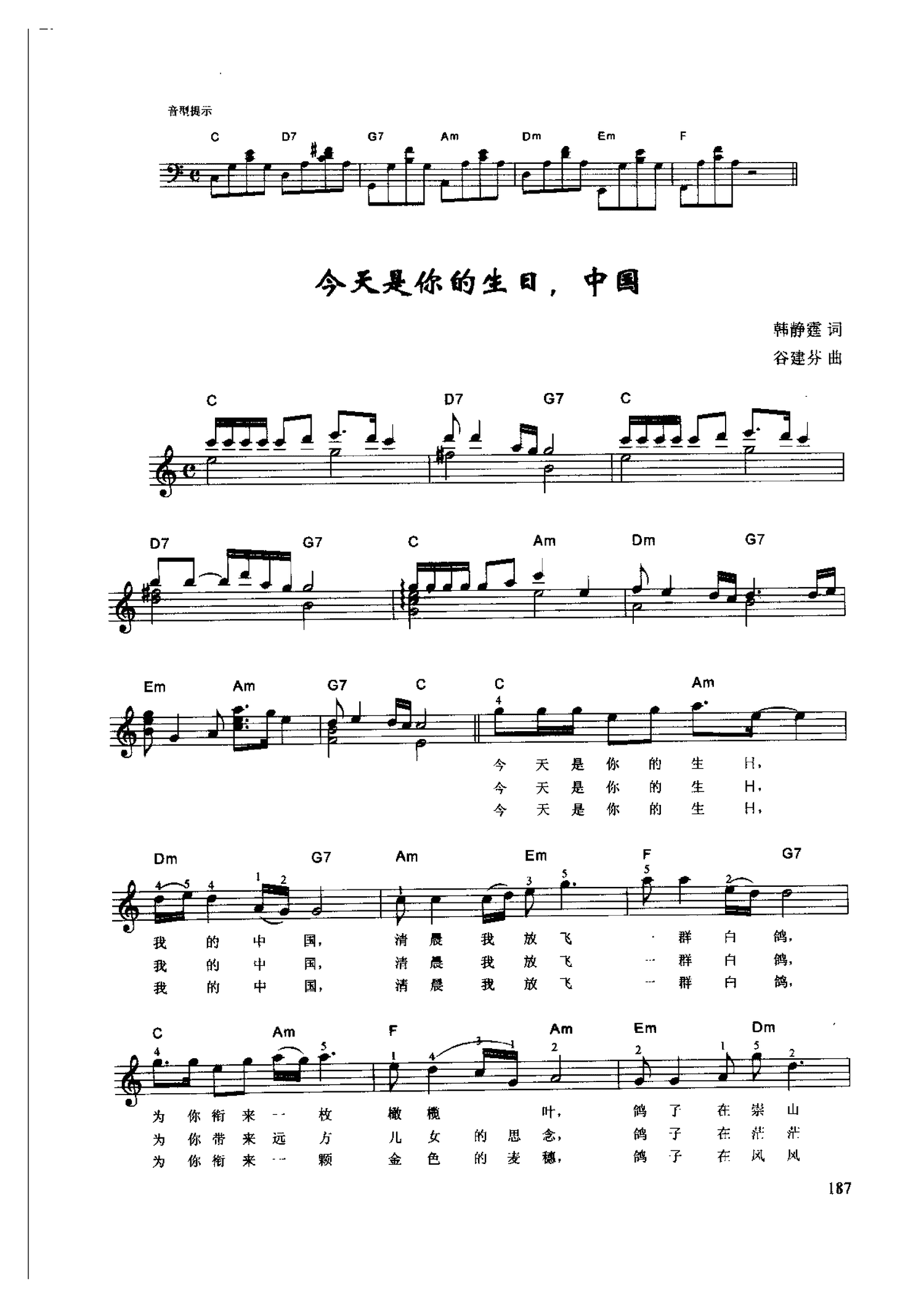 辛笛《钢琴即兴伴奏歌曲108首》之108【今天是你的生日,中国】韩静霆 词/谷建芬 曲简谱五线谱附歌词是乐器资源网于2015年10月04日 23:29:47整理更新,内容收录在钢琴乐谱栏目;乐器资源网免费分享专业、准确、规范、高清的钢琴乐谱简谱五线谱歌词等电子版资料,欢迎在线免费下载;乐器资源网无需注册会员,即可直接免费下载各类乐器学习相关资源。