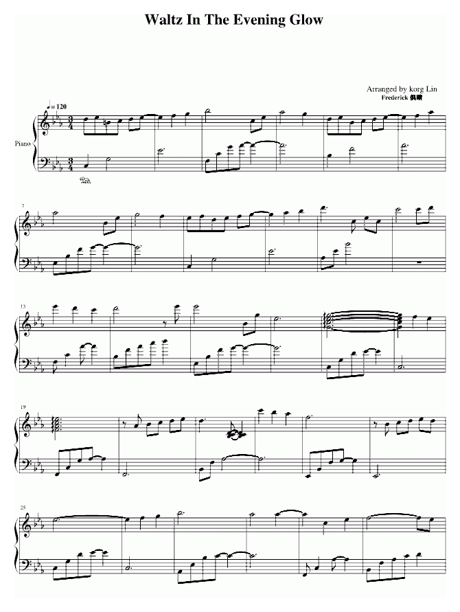 世界名曲 Waltz In The Evening Glow简谱五线谱附歌词是乐器资源网于2014年11月08日 17:21:39整理更新,内容收录在钢琴乐谱栏目;乐器资源网免费分享专业、准确、规范、高清的钢琴乐谱简谱五线谱歌词等电子版资料,欢迎在线免费下载;乐器资源网无需注册会员,即可直接免费下载各类乐器学习相关资源。