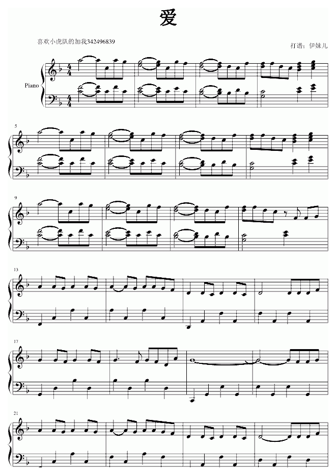 小虎队 钢琴谱 《爱》简谱五线谱附歌词是乐器资源网于2015年02月13日 18:37:31整理更新,内容收录在钢琴乐谱栏目;乐器资源网免费分享专业、准确、规范、高清的钢琴乐谱简谱五线谱歌词等电子版资料,欢迎在线免费下载;乐器资源网无需注册会员,即可直接免费下载各类乐器学习相关资源。