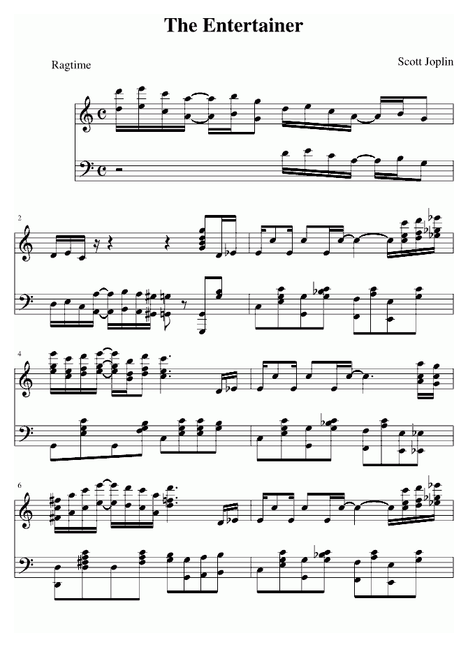 拉格泰姆 Scott Joplin the entertainer 完整版 钢琴谱简谱五线谱附歌词是乐器资源网于2014年12月27日 23:11:42整理更新,内容收录在钢琴乐谱栏目;乐器资源网免费分享专业、准确、规范、高清的钢琴乐谱简谱五线谱歌词等电子版资料,欢迎在线免费下载;乐器资源网无需注册会员,即可直接免费下载各类乐器学习相关资源。