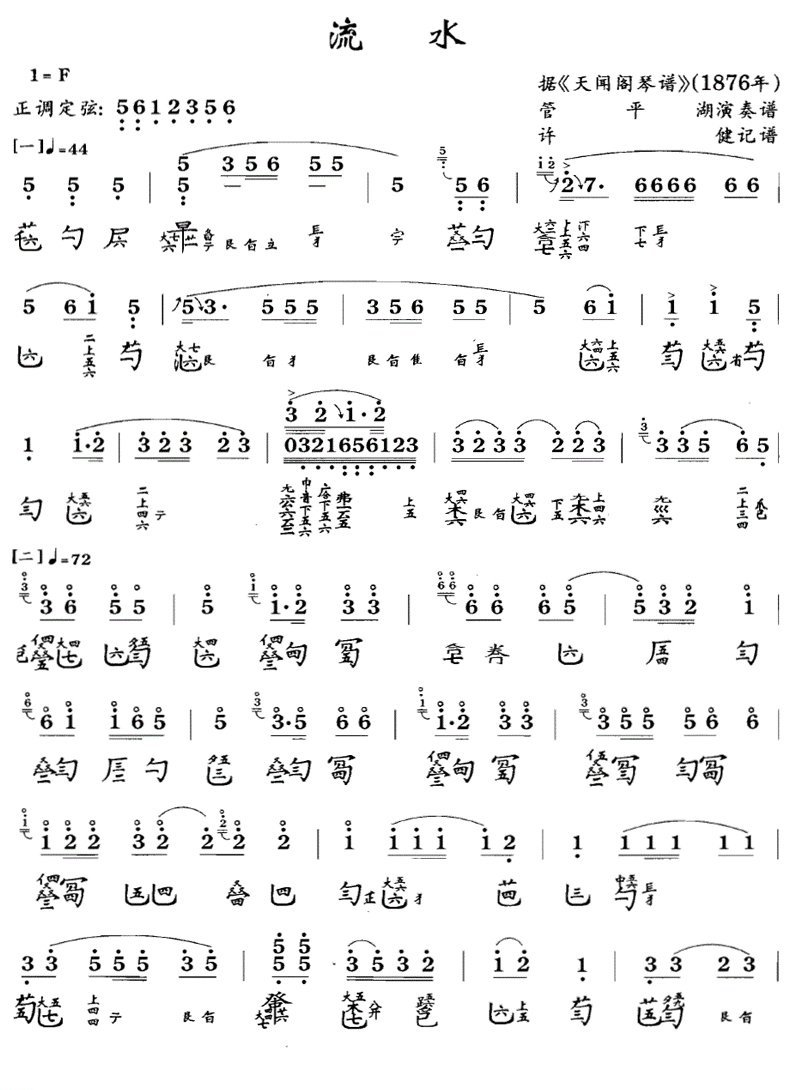传统古琴谱【流水】管平湖简谱五线谱附歌词是乐器资源网于2017年03月03日 01:45:57整理更新,内容收录在古琴乐谱栏目;乐器资源网免费分享专业、准确、规范、高清的古琴乐谱简谱五线谱歌词等电子版资料,欢迎在线免费下载;乐器资源网无需注册会员,即可直接免费下载各类乐器学习相关资源。