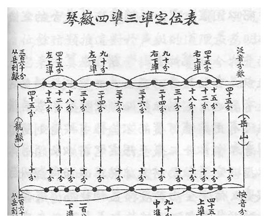 知道上表之数,然后就可以求徽分间的音位了。其算法,即任列某位之数,检前泛、按同声表中按音分数,择其相等或略小者减之,如恰好减尽,则此位即正当此徽,若有余数,则以余数为实,再检三准定位表中,取此徽与下一徽距离之数,以虚约实为法除之,即知还有几分几厘。(例:如列下一位本数二百四十,择九徽之数减之,恰好减尽,可知下一位为九徽;又列其半数一百二十、再半数六十,择五徽、二徽之数减之,都恰好减尽,可知下一位也为五徽、二徽。又如列上一位本数二百七十,择十徽之数减之,恰好减尽,可知上一位为十徽;又列其半数一百三十五,择五徽之数减之,还余一十五,即以它为实,而取五、六徽间距离数二十四,以虚数十约得二.四,为法除之,则得六、二、五,可知上一位为五徽六分二厘五毫之位;又列其再半数六十七.五,择二徽之数减之,还余七.五,以它为实,而取二、三徽间距离数一十二,以虚数十约得一.二,为法除之,则得六.二五,可知上一位又为二徽六分二厘五毫之位。余类推。)