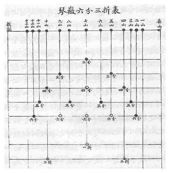 上表应分两层,上层横线为均分的次数,下层三横线为折半的次数,横线上的黑点即每次均分或折半所得的部位,白圈即为与前重出者。合六均分、三折半所得的部位(重出者不计)移上平列,就是十三徽。
