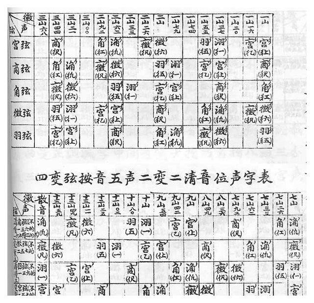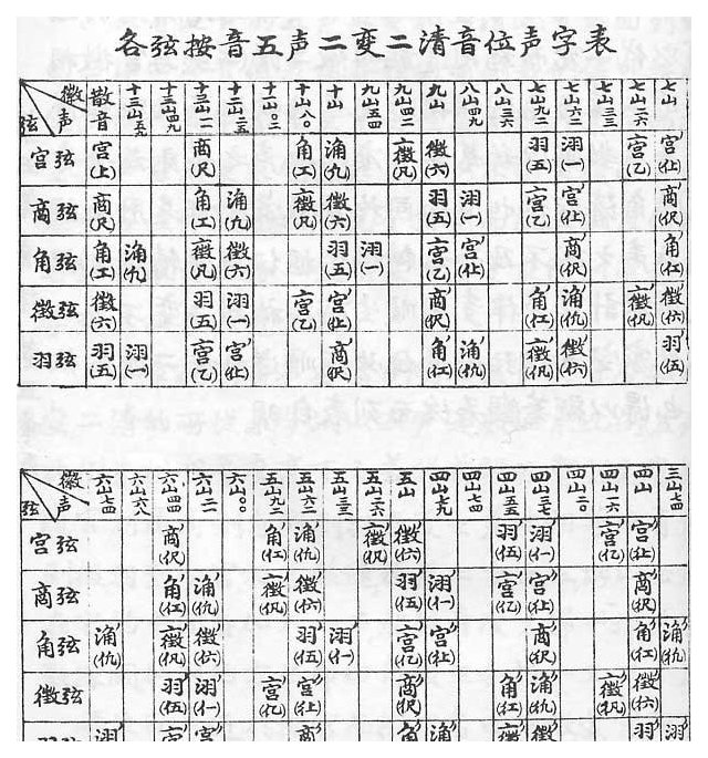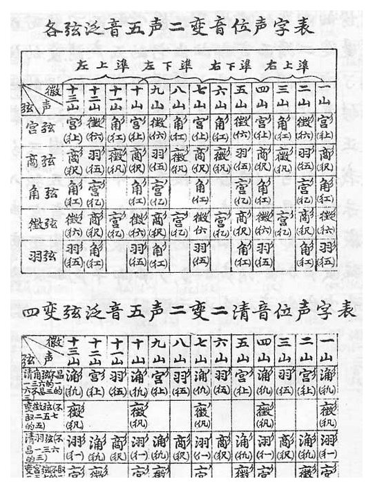 上面列的两个表,前一个是五调中所用的各弦。后一个是借正调弹外调,或由此调转彼调时所用不紧、慢的四变弦。(当慢而不慢,当紧而不紧,所以叫做变,是连二清而言。)都注出它的五声、清、变的位置,看熟了这两个表,凡是古琴谱中徽分错误的地方,都能够有所校正,就不患出音乖谬了。(例如谱载某曲是正调,减字中间有写大指或名指八徽三分取音的,我们就可以在各弦按音表中去查五(角弦)弦八徽三六,未注出是什么声,只八徽四九注得有宫声,可知八徽三分即八徽四九的错误。)表中凡是正声不加记号,变声加亠,清声加 氵,少声(即半声)加ノ,少少声加ノノ,少少少声加 彡,以示区别。
