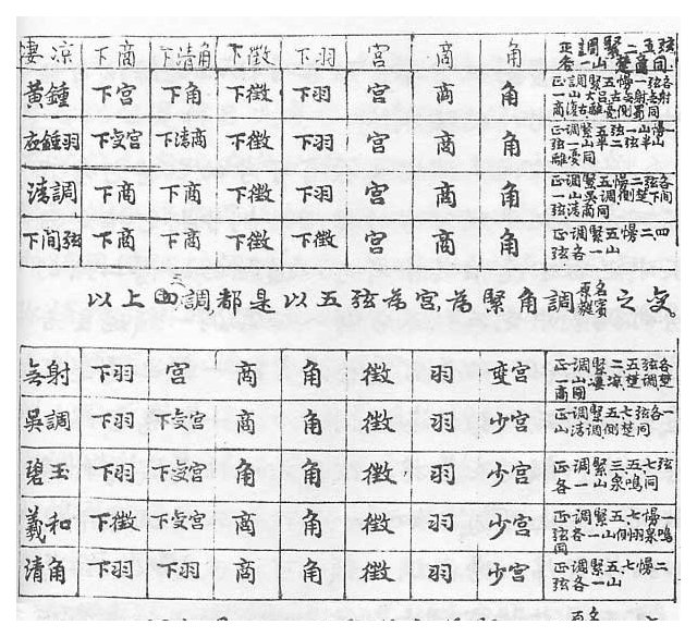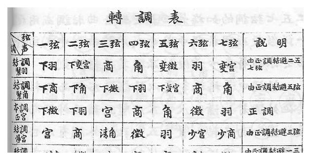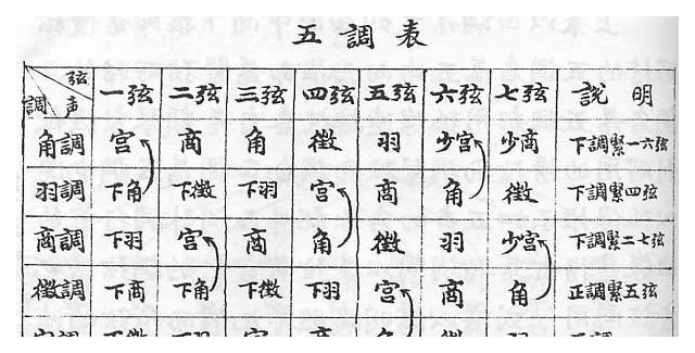 上表以最下一行宫调为主,顺次上推,为徵、商、羽、角四调,都是由紧角为宫转出,表中画有弧线者,即是每次所紧之弦。