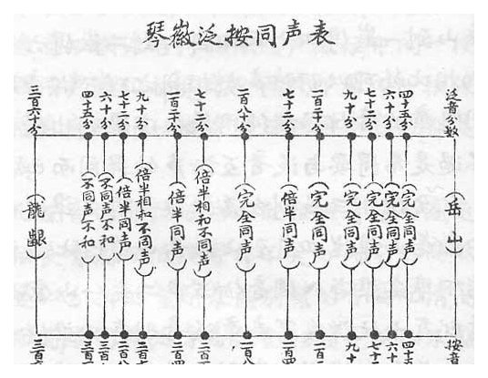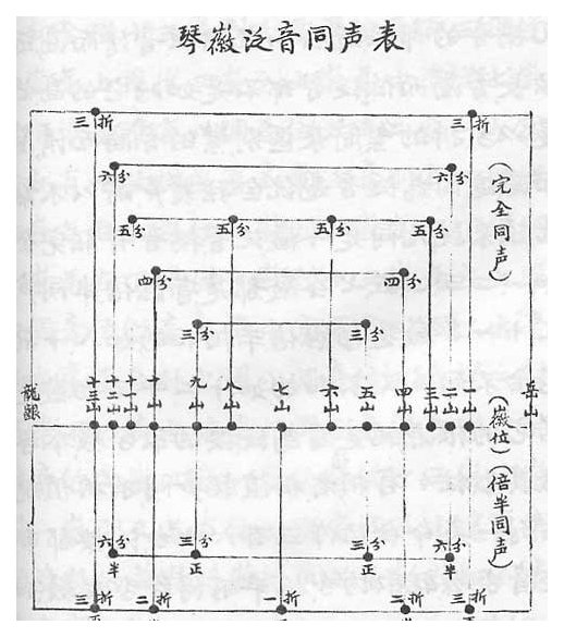 弦间徽际,可取同声之处极多,而上表定弦,是按照传统的方法,只用九徽、十徽,且必以按外弦散内弦为限,不然,宁可阙着,这因为九徽为本弦的子声(即本弦散音的纯五度处),十徽为本弦的母声(即本弦散音的纯四度处),以母子来求他弦,音最和协。又因外弦音浊,内弦音清,按浊散清,音恰如一(成同度阙系),所以可取。