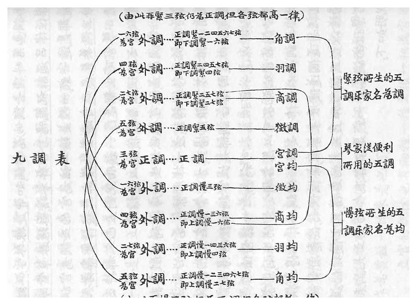 上表以正调为主,列在正中,向下推,即为慢弦所转的五调,名为五均。向上推,即为紧弦所转的五调,名为五调,都用弧线连接,使各自为类。琴家从便利所用的慢弦两调,紧弦两调,合正调为五调,也连以弧线,是指出某两调同以某弦为宫,它的调弦法也应该同用一式,所以证明虽有九个,而和弦的法式实止有五个。每调中间的两行小注,一行是说明递转的方法 ,一行是说明相互的关系,又所以证明九调虽曲一调而生,其间又各有联贯的脉络和自然的顺序。