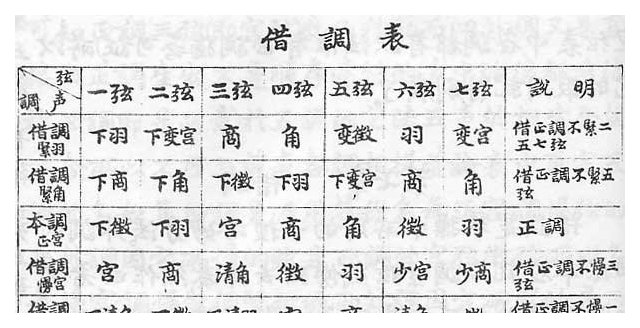 正调的弦,既为外调所借,那么各弦五的名称自然应该从外调而定,惟所当紧不紧当慢不慢的弦,它的音在外调所用五声之外,是叫做变弦,就是清角、清羽、变宫、变徵四种弦;借调中有只用一种的,有兼用两种的,列表于下。(表中以原来的正调为本调,借弹的外调均为借调。)