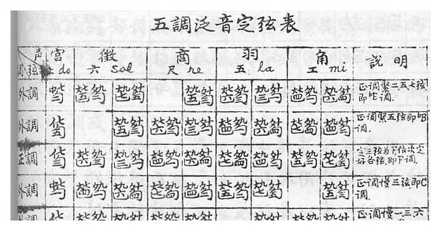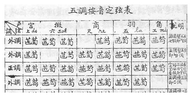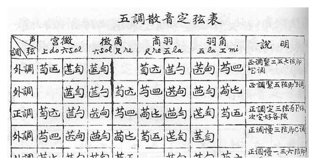 上表排列五调,每调后面是以本调所分的五音逐一注明弦位。凡审定某曲用某调,而韵收某弦散音的,便可随着表去求得它是什么音。表中有方框的各音,是本调的本音,以外都是借音(本音概在三弦,而与本调同名,借音则否)。除去借音,即为乐家在五调,而这种借音,都是从他均所属的各调中借来的(本表仅列宫,徵等五调,此外琴家的正调、外调、借调、转调、变调,都各有它的五音,可以照此类推,不另详列)。