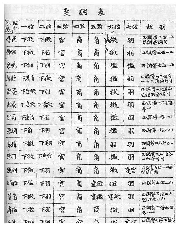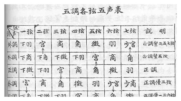 琴家所定五调、紧、慢互施,实用较为便利,已经是很久的传统了,自不可废,兹列表于下。按正调原名宫调;正调慢三弦的调,原名慢角调,又名复古调、碧玉调;正调慢一、三、六弦的调,原名慢宫调,又名泉鸣调;正调紧五弦的调,原名蕤宾调,又名紧羽调、金羽调、侧羽调;都很纷杂混乱。兹考求实在,姑且将它们的名称更定如下表: