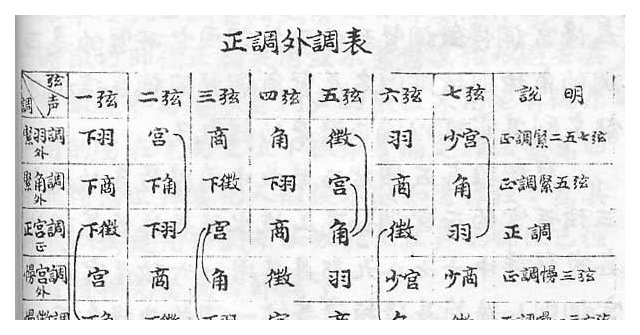 上请以中行正调为主上下推为四外调。表中弧线在声左者,表示正调原来所慢的高强度;在声右者,表示正调原来所紧的弦。