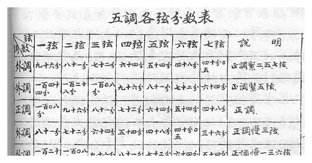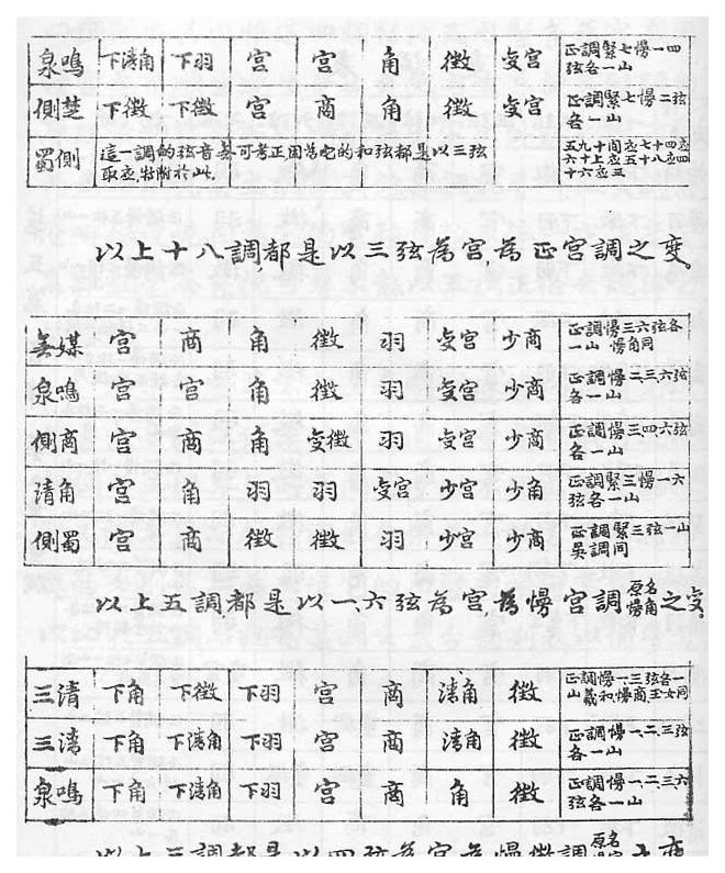 上表宜与前分数表对照,可以明了声数相阙的道理。表中正调,即从王坦《琴旨》例,定三弦为宫。其一弦为宫的,是正调下面一调(即慢三弦的外调)。如果将它互混为一,就弄成名称和实际不相符合了。