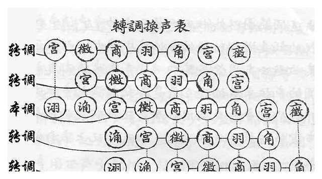 转调的方法,必就本调避去一、二正声,而用它的变声或清声,这固然是定例,然而也有虽用清、变,并不避去正声,仍然相骠为用的,如《耕歌》、《醉渔唱晚》、《石上流泉》、《天台引》、《油庭秋思》、《禹会涂山》、《思贤操》等曲,那就应当仔细辨别它是否转调,大概就所用的多少去辨别,如用正声多,用清、变少,就并非转调,不过于本调五声之外,加用一、二变声或清声罢了;若用清、变多,用正声少,就仍是转调,因为那是用这一、二正声用为转调中所加用的清、变。又转调仅于一句两句者,有人说也当看做本调的清、变,不得认为是转调,因为它所用太少的缘故,,这种说法也通。