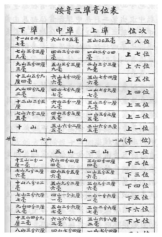 上表也分四行,第一行为下准各音位,都是由前表本数中求出。第二行为中准各音位,都是由前表半数中求出。第三行为上准各音位,都是由前表再半数中求出。第四行记明位次。没有前表,则此表不能成立,没有此表,则前表也徒然等于虚设。(两表应合作一表看)