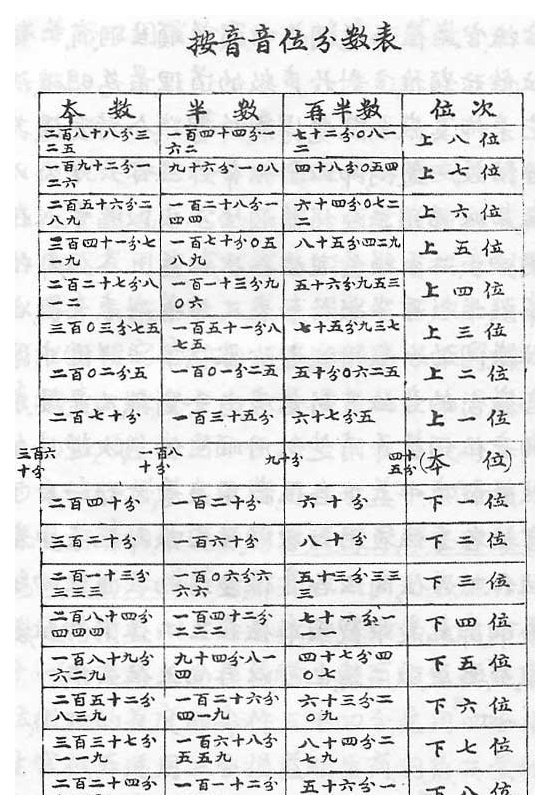 位,就是各弦按音所取五声、二变或二清的定位。在泛音虽也有它的位,然必须当徽才能发声,徽外的位,没有用处,尽可置而不论。惟有按音则随处可以得音,不能以十三徽来限定它,所以必须另外设数以指明它音位的所在,才能准此取得谐叶的音声。按音音位,完全由弦度损益相生而得,有顺生、逆生两法;顺生者用三分损一、三分益一,与五声相生的方法一样;逆生者则用二分益一、四分损一,实际就是前算法的还原。考曹庭栋琴学,五坦《琴旨》,祝凤鸣《与古斋琴谱》等书,都是以琴声之数施于弦度,就此递为损益,以生各音位。如宫弦的长度,即命作八十一分,递用三分损益,顺生徵、商、羽、角和二变的音位;徵弦的长度,即命作五十四分,先用逆生宫位,再递用三分损益,顺生商、羽、角,二变的音位,商弦的长度,即命作七十二分,先用两次四分损一,逆生徵、宫二位,再递用三分损益顺生羽、角、二变的单位,余弦类推。这对于声数的道理最为明确。只是用它来布算徽分,就觉得周折繁杂。今特变通其法,为各弦设一通例,即以全弦命作三百六十分以为本位;由此,递用三分损益顺生八次,以为下八位;又递用四分、二分损益逆生八次,以为上八位;都备列其本数、半数、再半数于一表,又准着此表之数,合前徽位、徽间的分数,用减整除零法(算法详后)求得三准各徽分的音位,另列为表,与之对照。凡是要求某弦的音位,须先弄清楚它用顺生的几次,逆生的几次,然后就表中上、下各位,截取来看,不难一目了然。(如宫弦各音位,应用六次顺生去取,即就表中截取本位和下六位;商弦各音位,应用两次逆生、四次顺生去取,即就表中截取本位和上二位、下四位;余弦类推。或要更取二清,也可以再向上位推。)