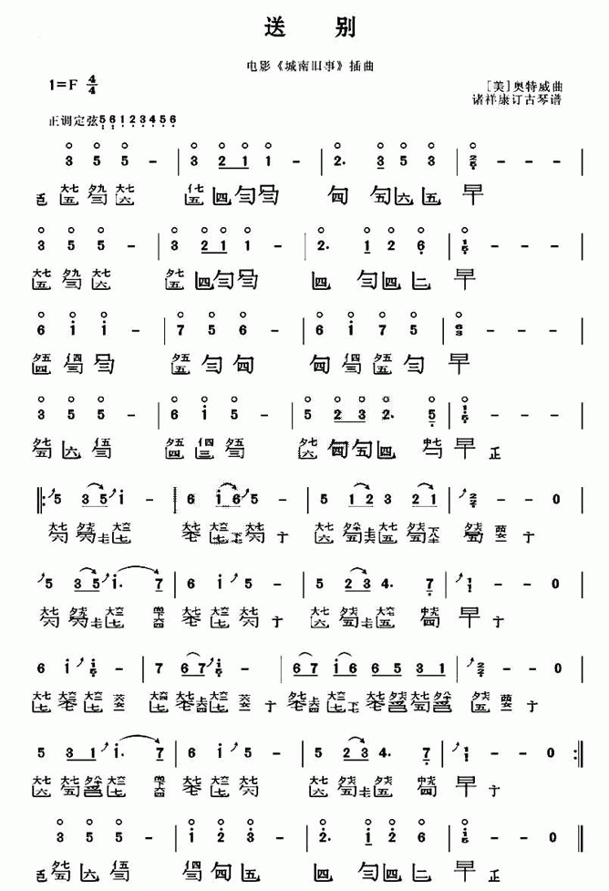古琴名曲谱【送别】图片谱简谱五线谱附歌词是乐器资源网于2017年02月19日 01:23:46整理更新,内容收录在古琴乐谱栏目;乐器资源网免费分享专业、准确、规范、高清的古琴乐谱简谱五线谱歌词等电子版资料,欢迎在线免费下载;乐器资源网无需注册会员,即可直接免费下载各类乐器学习相关资源。