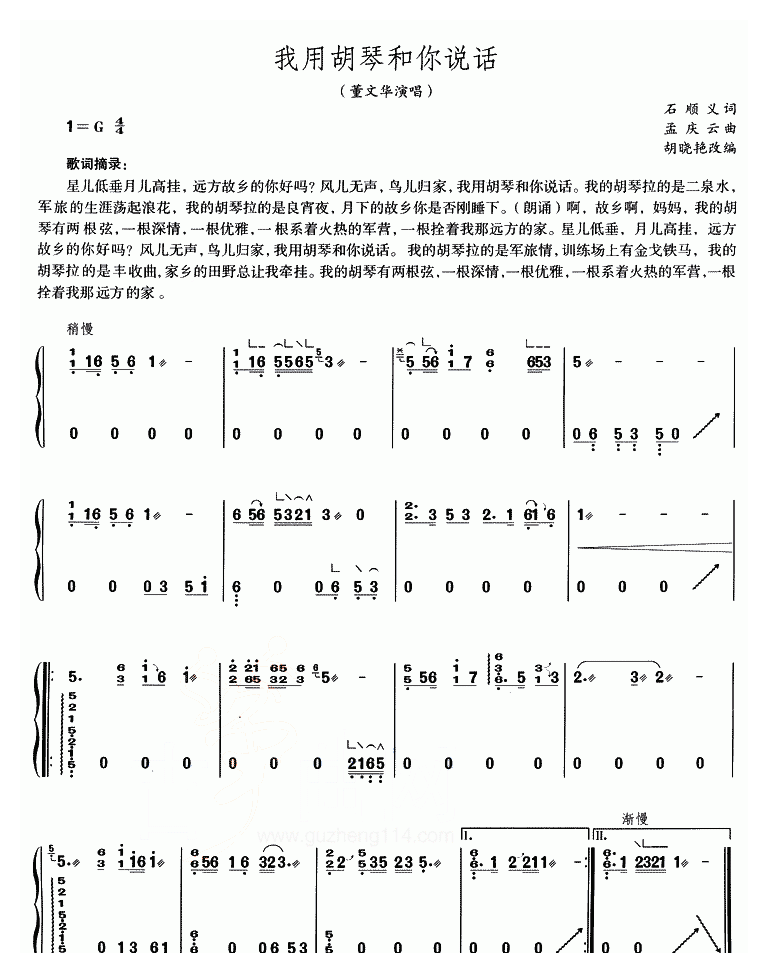 古筝谱【我用胡琴和你说话】简谱五线谱附歌词是乐器资源网于2016年06月07日 23:14:29整理更新,内容收录在古筝乐谱栏目;乐器资源网免费分享专业、准确、规范、高清的古筝乐谱简谱五线谱歌词等电子版资料,欢迎在线免费下载;乐器资源网无需注册会员,即可直接免费下载各类乐器学习相关资源。