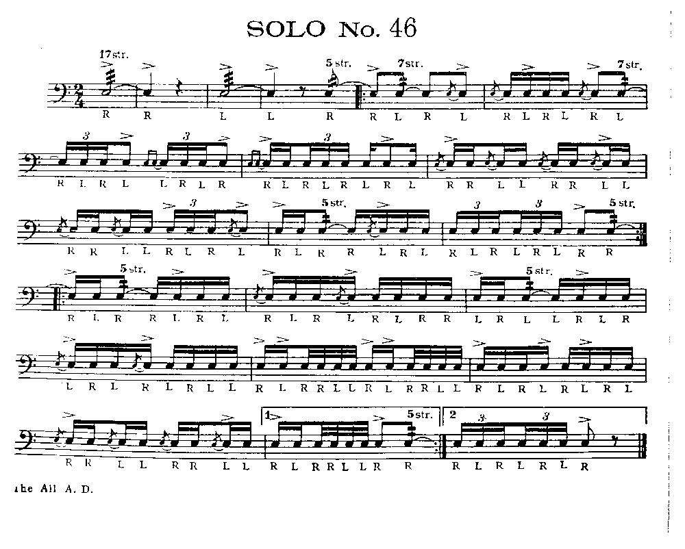 美国军鼓150条精华SOLO系列之《SOLO No.46》简谱五线谱附歌词是乐器资源网于2014年07月07日 16:37:59整理更新,内容收录在爵士鼓乐谱栏目;乐器资源网免费分享专业、准确、规范、高清的爵士鼓乐谱简谱五线谱歌词等电子版资料,欢迎在线免费下载;乐器资源网无需注册会员,即可直接免费下载各类乐器学习相关资源。