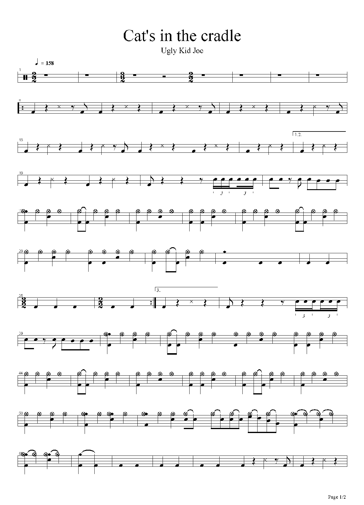 爵士鼓谱【Ugly Kid Joe - Cats in the cradle】简谱五线谱附歌词是乐器资源网于2017年03月17日 03:43:27整理更新,内容收录在爵士鼓乐谱栏目;乐器资源网免费分享专业、准确、规范、高清的爵士鼓乐谱简谱五线谱歌词等电子版资料,欢迎在线免费下载;乐器资源网无需注册会员,即可直接免费下载各类乐器学习相关资源。