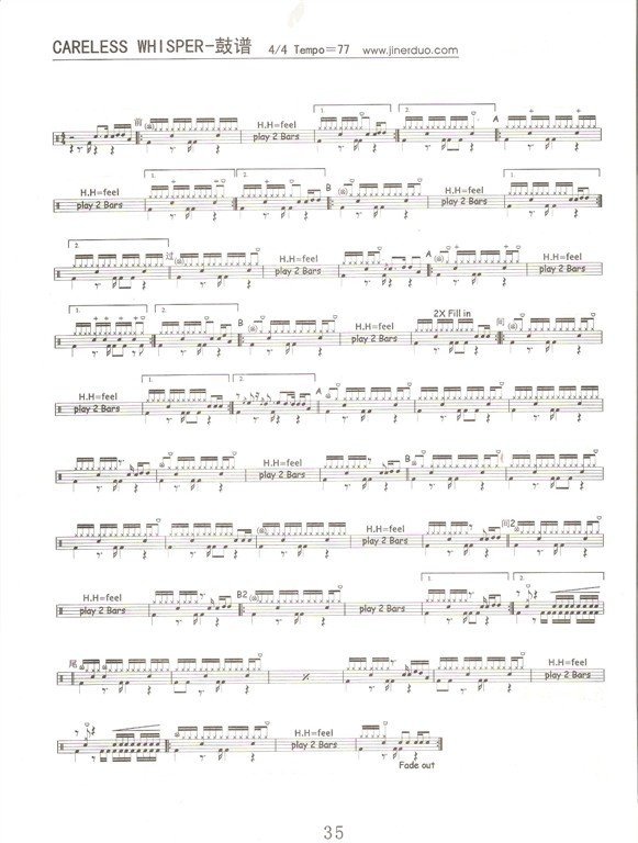 鼓谱架子鼓谱:careless whisper简谱五线谱附歌词是乐器资源网于2014年06月24日 14:28:13整理更新,内容收录在爵士鼓乐谱栏目;乐器资源网免费分享专业、准确、规范、高清的爵士鼓乐谱简谱五线谱歌词等电子版资料,欢迎在线免费下载;乐器资源网无需注册会员,即可直接免费下载各类乐器学习相关资源。
