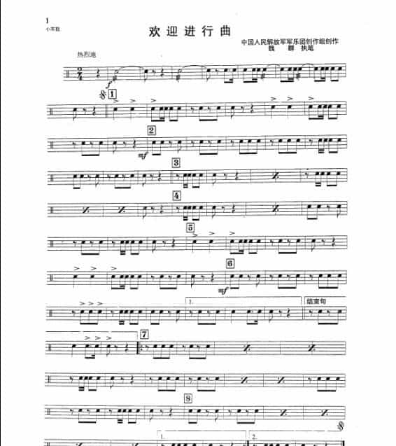鼓谱架子鼓谱:欢迎进行曲简谱五线谱附歌词是乐器资源网于2014年06月24日 14:27:39整理更新,内容收录在爵士鼓乐谱栏目;乐器资源网免费分享专业、准确、规范、高清的爵士鼓乐谱简谱五线谱歌词等电子版资料,欢迎在线免费下载;乐器资源网无需注册会员,即可直接免费下载各类乐器学习相关资源。