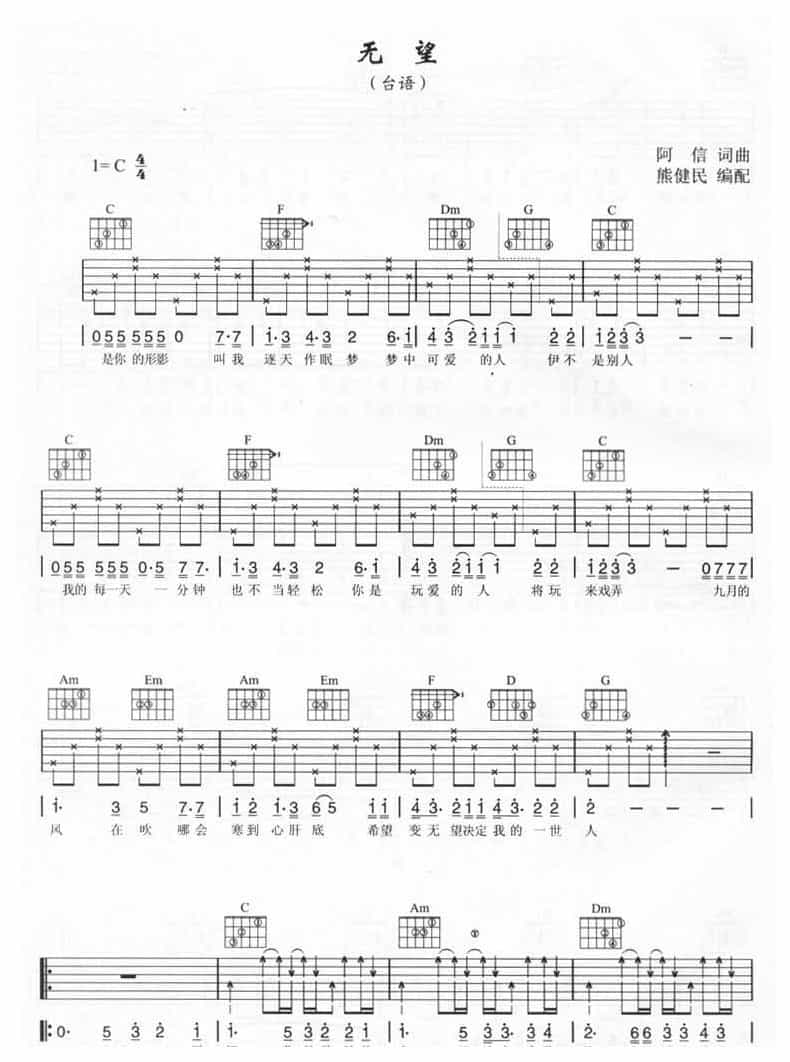 五月天吉他谱【无望】C调高清谱简谱五线谱附歌词是乐器资源网于2016年04月20日 18:08:01整理更新,内容收录在吉他乐谱栏目;乐器资源网免费分享专业、准确、规范、高清的吉他乐谱简谱五线谱歌词等电子版资料,欢迎在线免费下载;乐器资源网无需注册会员,即可直接免费下载各类乐器学习相关资源。