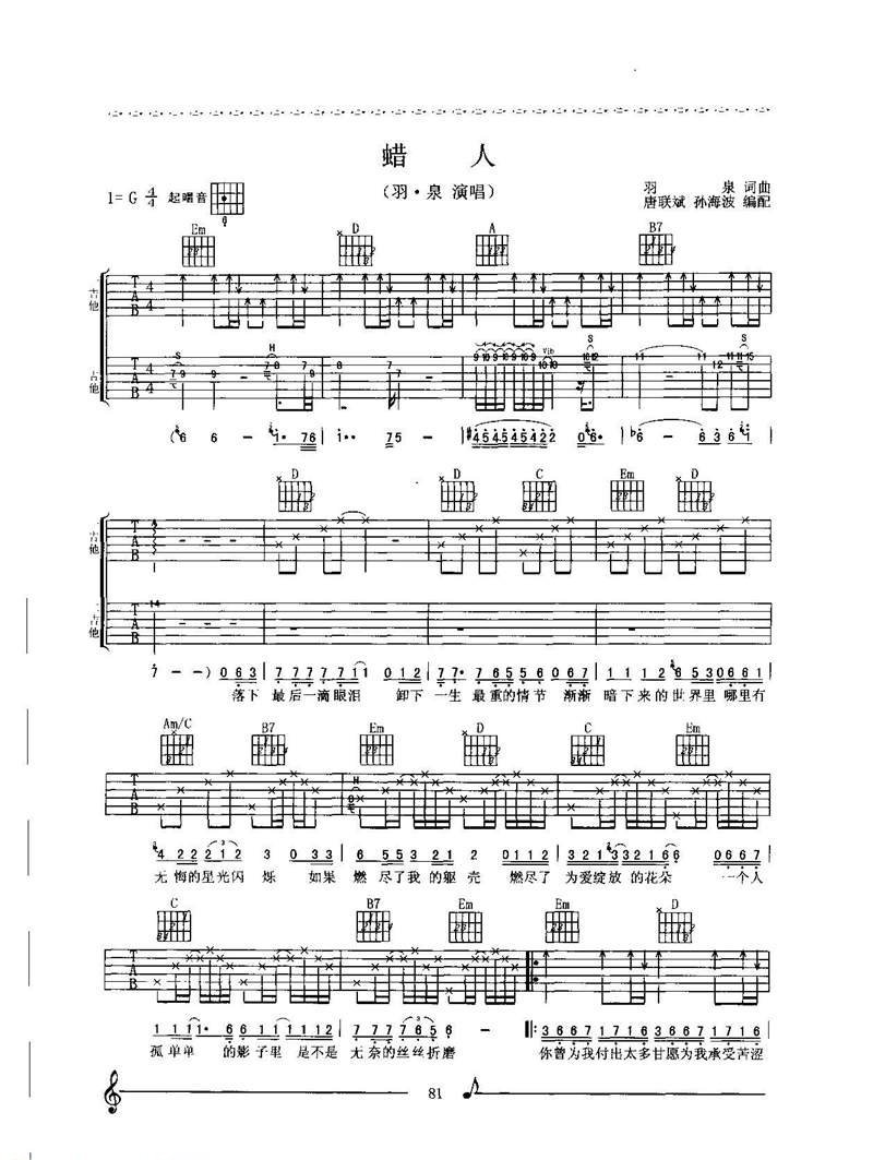 羽泉吉他谱 蜡人简谱五线谱附歌词是乐器资源网于2014年06月22日 11:54:32整理更新,内容收录在吉他乐谱栏目;乐器资源网免费分享专业、准确、规范、高清的吉他乐谱简谱五线谱歌词等电子版资料,欢迎在线免费下载;乐器资源网无需注册会员,即可直接免费下载各类乐器学习相关资源。