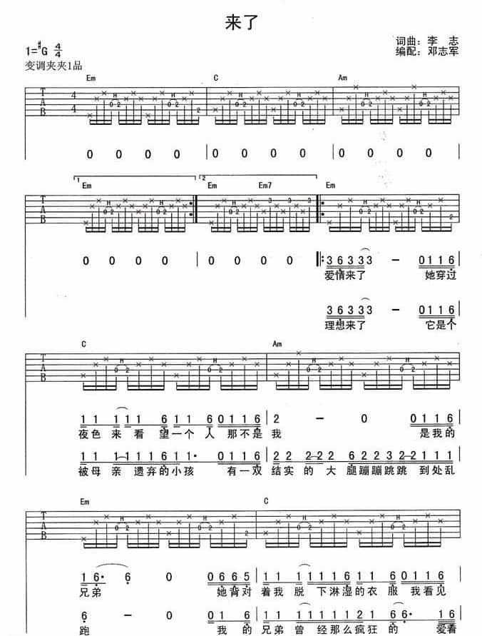 李志经典歌曲吉他谱 来了简谱五线谱附歌词是乐器资源网于2014年06月23日 16:40:19整理更新,内容收录在吉他乐谱栏目;乐器资源网免费分享专业、准确、规范、高清的吉他乐谱简谱五线谱歌词等电子版资料,欢迎在线免费下载;乐器资源网无需注册会员,即可直接免费下载各类乐器学习相关资源。