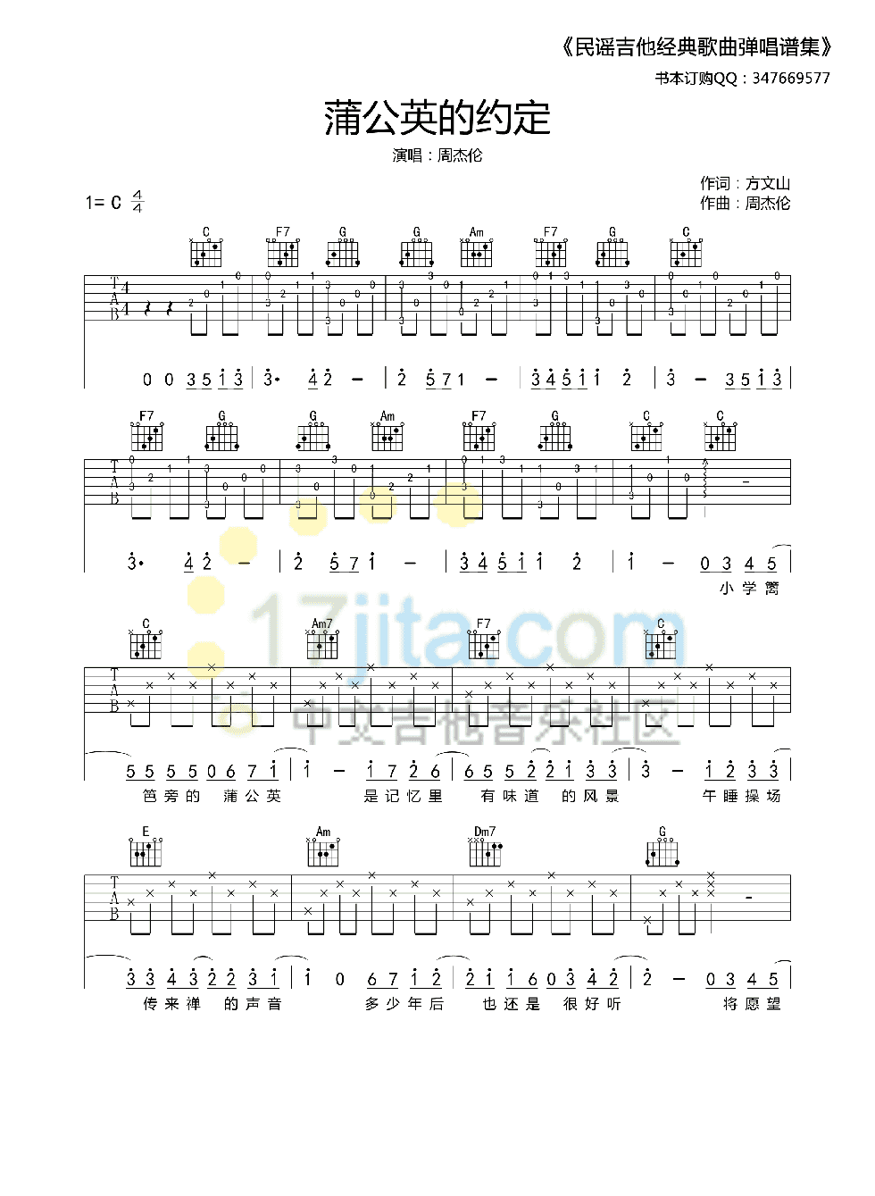 【2015热门吉他歌曲谱排行榜】周杰伦《蒲公英的约定》吉他谱 C调高清版简谱五线谱附歌词是乐器资源网于2015年06月28日 10:28:39整理更新,内容收录在吉他乐谱栏目;乐器资源网免费分享专业、准确、规范、高清的吉他乐谱简谱五线谱歌词等电子版资料,欢迎在线免费下载;乐器资源网无需注册会员,即可直接免费下载各类乐器学习相关资源。