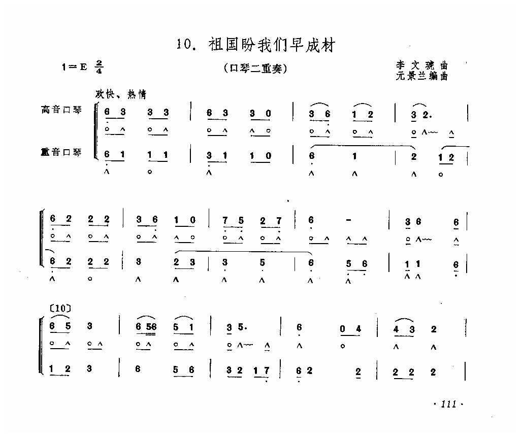 口琴重奏谱【祖国盼我们早成材】少儿口琴二重奏乐曲简谱五线谱附歌词是乐器资源网于2015年05月01日 20:53:22整理更新,内容收录在口琴乐谱栏目;乐器资源网免费分享专业、准确、规范、高清的口琴乐谱简谱五线谱歌词等电子版资料,欢迎在线免费下载;乐器资源网无需注册会员,即可直接免费下载各类乐器学习相关资源。