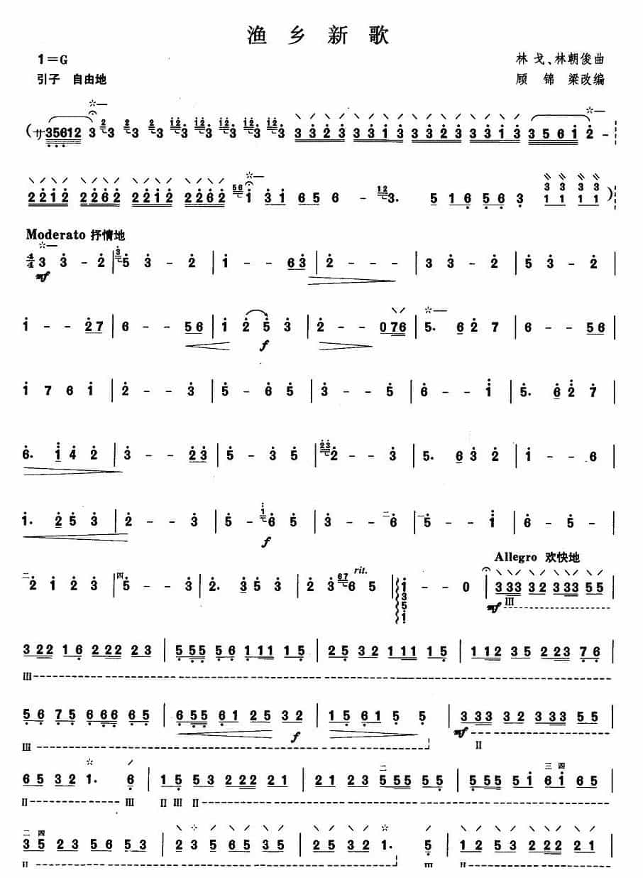 柳琴考级曲谱【柳琴四级:渔乡新歌】简谱五线谱附歌词是乐器资源网于2015年07月12日 20:10:46整理更新,内容收录在柳琴乐谱栏目;乐器资源网免费分享专业、准确、规范、高清的柳琴乐谱简谱五线谱歌词等电子版资料,欢迎在线免费下载;乐器资源网无需注册会员,即可直接免费下载各类乐器学习相关资源。