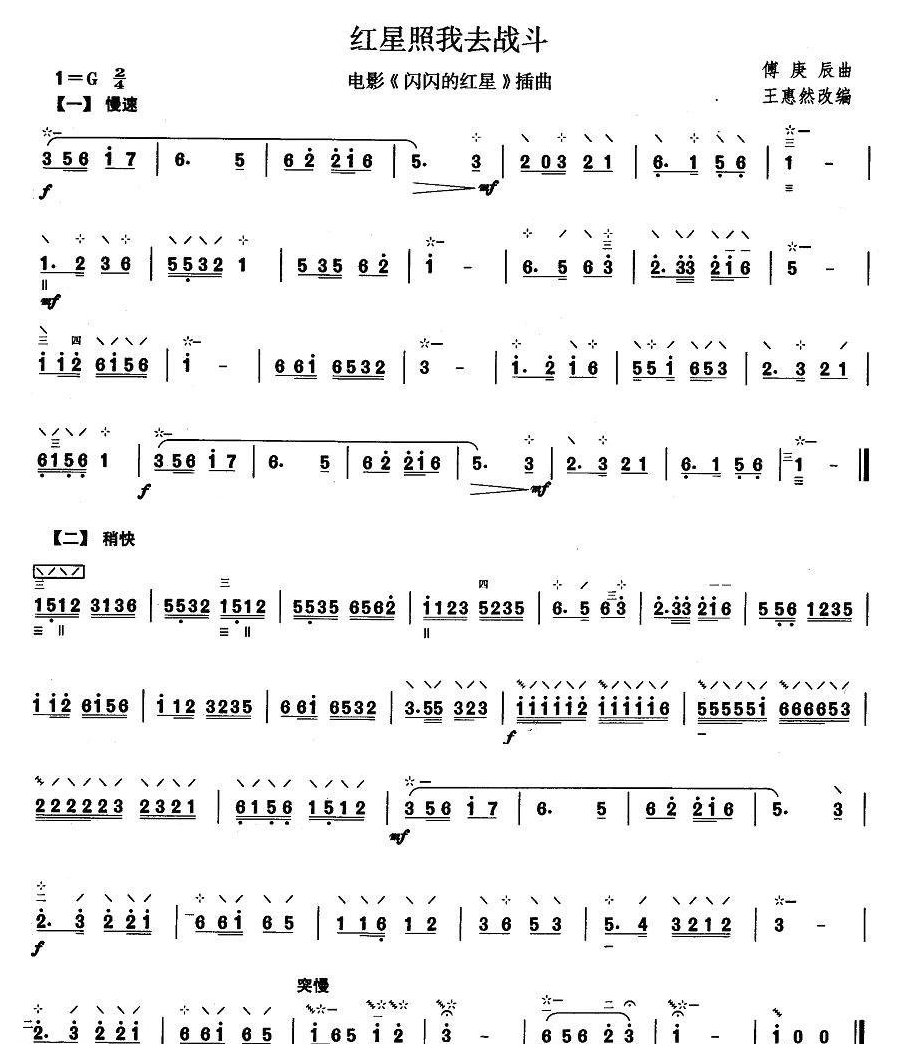 柳琴考级曲谱【柳琴考级曲目二级:红星照我去战斗】简谱五线谱附歌词是乐器资源网于2015年07月12日 21:36:28整理更新,内容收录在柳琴乐谱栏目;乐器资源网免费分享专业、准确、规范、高清的柳琴乐谱简谱五线谱歌词等电子版资料,欢迎在线免费下载;乐器资源网无需注册会员,即可直接免费下载各类乐器学习相关资源。