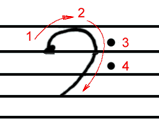 画这个谱号是从第二间开始的。从第二线开始向上紧靠着第三线顺时针往下画半个园,再紧贴着第一线画一个大于起口的圆形,然后,躲开这个圆形的开始的缺口,向上、向右、冲出第五线再向左,逆时针画一个小圆,回来,在第四线上定义。然后,从中间下来,穿过第三线、第二线,再穿过第一线,伸出尾巴来后,再左转,顺时针画半个小小的圆,结束时涂上一个小黑点点。这样,一个高音谱号就可以大功告成了。看起来复杂,实际画起来你会发现并不是很困难的。
