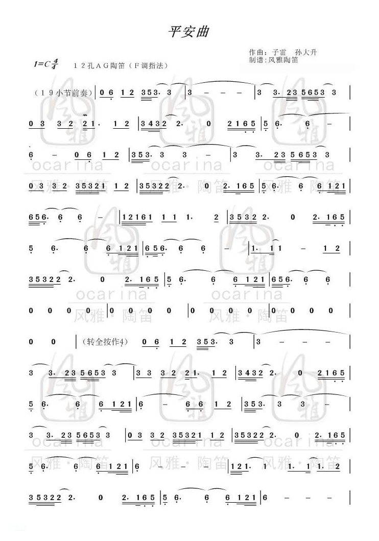 陶笛谱【平安曲】子雷