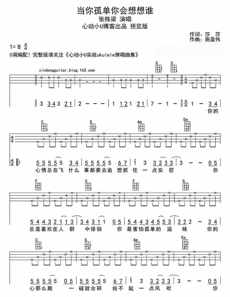 UKULELE谱【当你孤单你会想起谁】张栋梁简谱五线谱附歌词是乐器资源网于2016年10月11日 09:57:07整理更新,内容收录在尤克里里乐谱栏目;乐器资源网免费分享专业、准确、规范、高清的尤克里里乐谱简谱五线谱歌词等电子版资料,欢迎在线免费下载;乐器资源网无需注册会员,即可直接免费下载各类乐器学习相关资源。