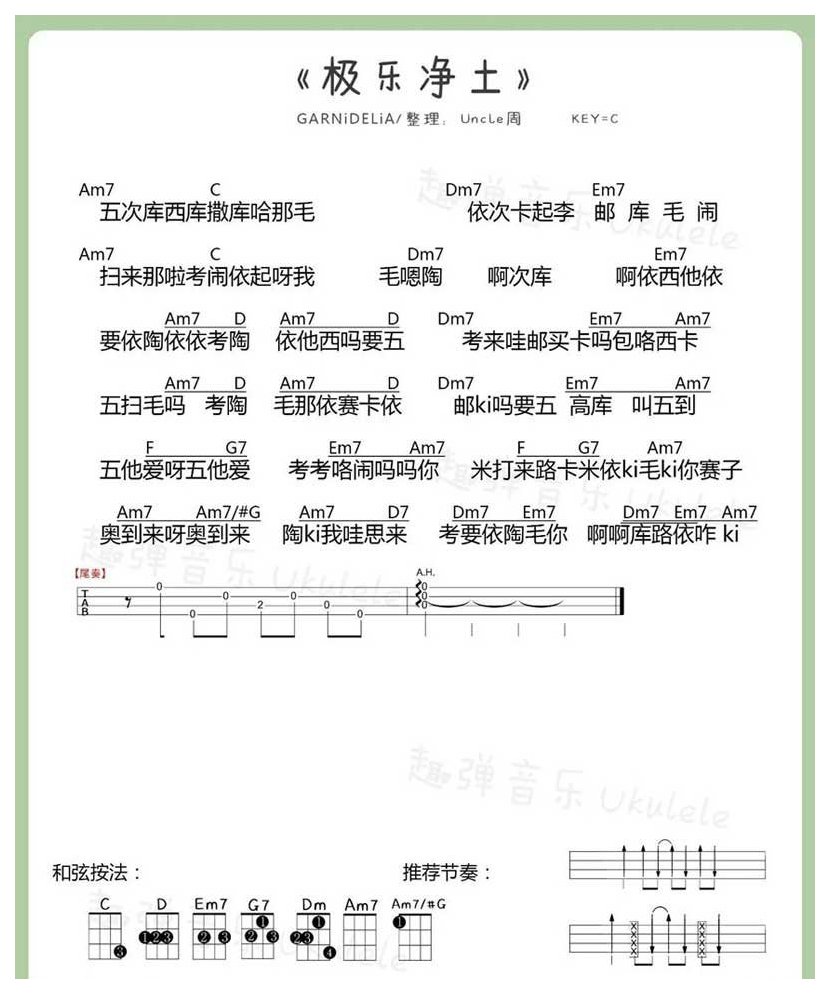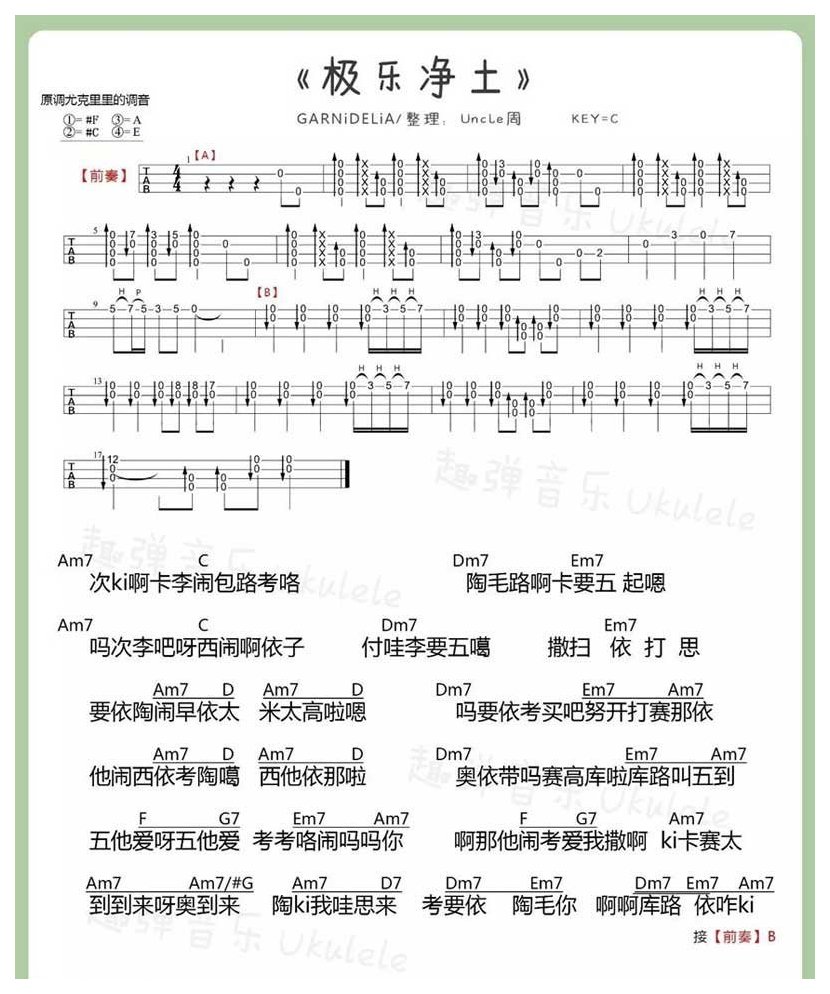 UKULELE谱【极乐净土】GARNiDELiA简谱五线谱附歌词是乐器资源网于2016年11月21日 11:50:13整理更新,内容收录在尤克里里乐谱栏目;乐器资源网免费分享专业、准确、规范、高清的尤克里里乐谱简谱五线谱歌词等电子版资料,欢迎在线免费下载;乐器资源网无需注册会员,即可直接免费下载各类乐器学习相关资源。