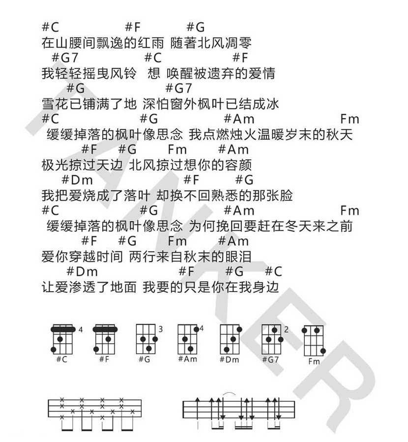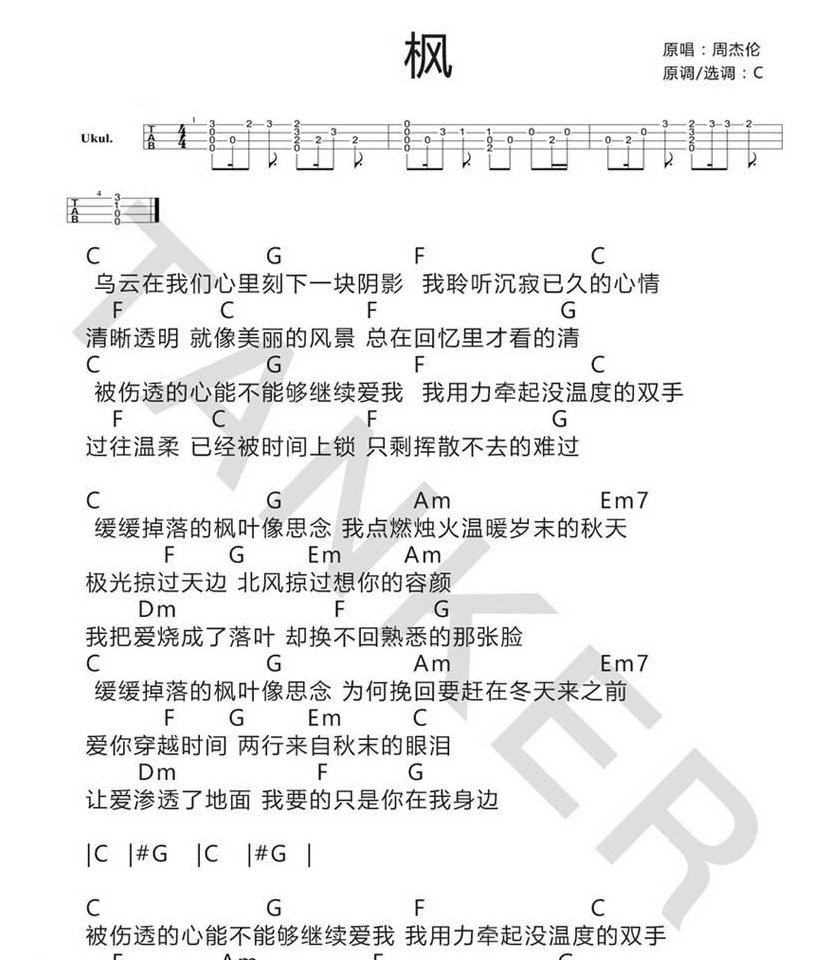 UKULELE谱【枫】周杰伦简谱五线谱附歌词是乐器资源网于2016年11月22日 11:37:03整理更新,内容收录在尤克里里乐谱栏目;乐器资源网免费分享专业、准确、规范、高清的尤克里里乐谱简谱五线谱歌词等电子版资料,欢迎在线免费下载;乐器资源网无需注册会员,即可直接免费下载各类乐器学习相关资源。
