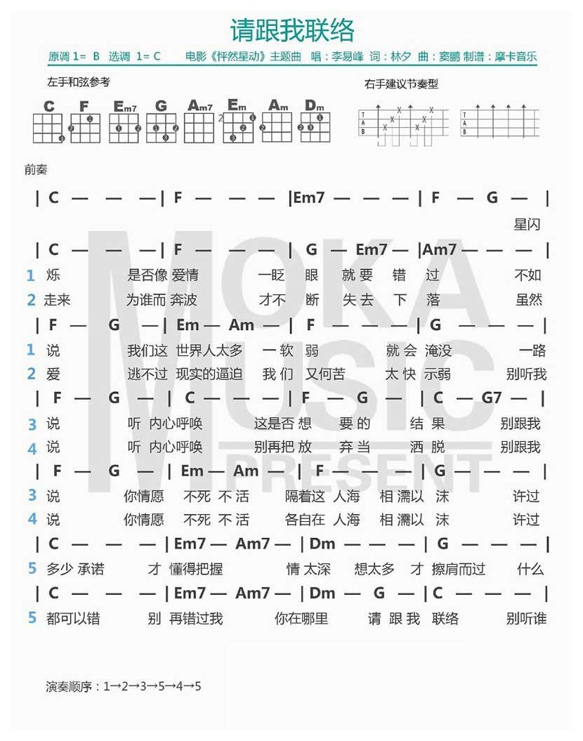 UKULELE谱【请跟我联络】李易峰《怦然星动》主题曲简谱五线谱附歌词是乐器资源网于2016年10月30日 13:10:37整理更新,内容收录在尤克里里乐谱栏目;乐器资源网免费分享专业、准确、规范、高清的尤克里里乐谱简谱五线谱歌词等电子版资料,欢迎在线免费下载;乐器资源网无需注册会员,即可直接免费下载各类乐器学习相关资源。