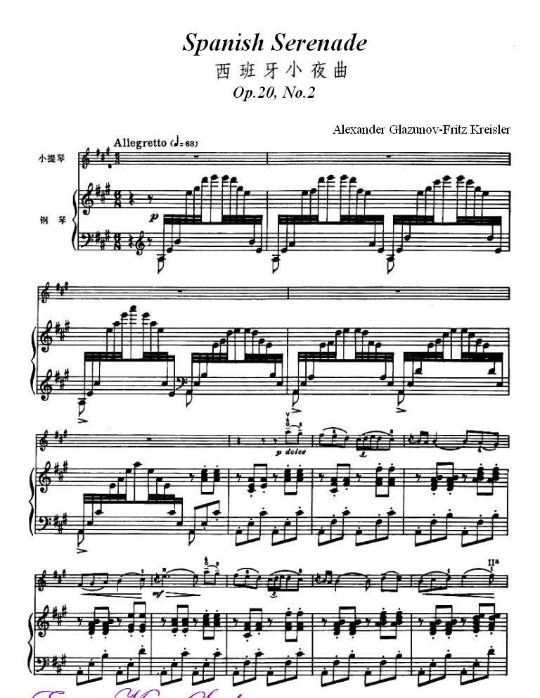 克莱斯勒-格拉祖诺夫-西班牙小夜曲 作品20 第2首Piano Fritz Kreisler, Alexander Glazunov, Spanish Serenade Op.20,No.2简谱五线谱附歌词是乐器资源网于2014年09月09日 23:07:31整理更新,内容收录在小提琴乐谱栏目;乐器资源网免费分享专业、准确、规范、高清的小提琴乐谱简谱五线谱歌词等电子版资料,欢迎在线免费下载;乐器资源网无需注册会员,即可直接免费下载各类乐器学习相关资源。