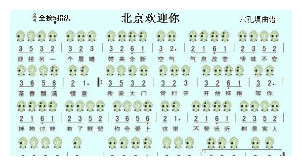 六孔埙曲谱【北京欢迎你】简谱五线谱附歌词是乐器资源网于2017年03月13日 10:29:41整理更新,内容收录在陶埙乐谱栏目;乐器资源网免费分享专业、准确、规范、高清的陶埙乐谱简谱五线谱歌词等电子版资料,欢迎在线免费下载;乐器资源网无需注册会员,即可直接免费下载各类乐器学习相关资源。